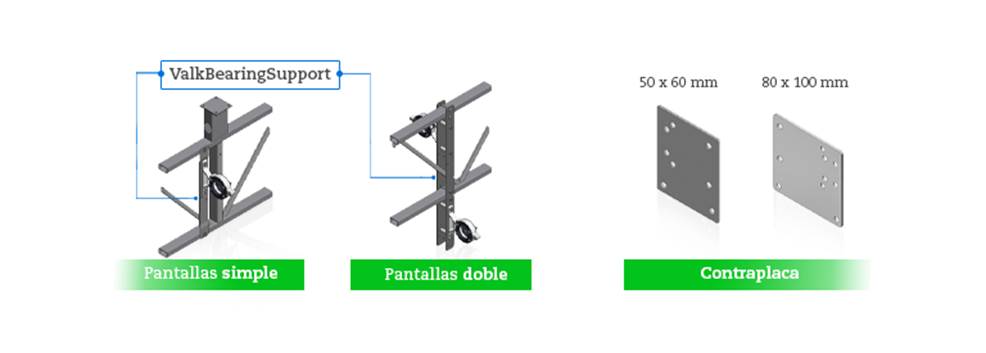 - ¿No es posible o no está permitido taladrar en la estructura de acero? Entonces la variante de sujeción ValkBearingSupport es una alternativa excelente. También está disponible en una variante adecuada para pantallas dobles.